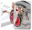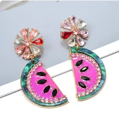 Watermelon-shaped metal dangle drop down earring studded with flower petals. Suitable for anytime of the day. Adds a little sweet taste to any a nice outfit.